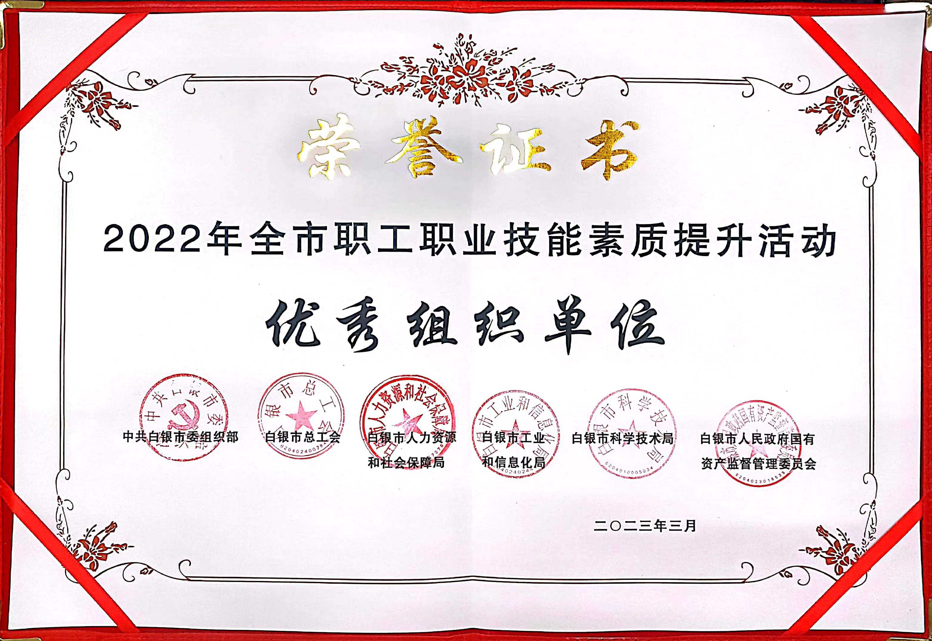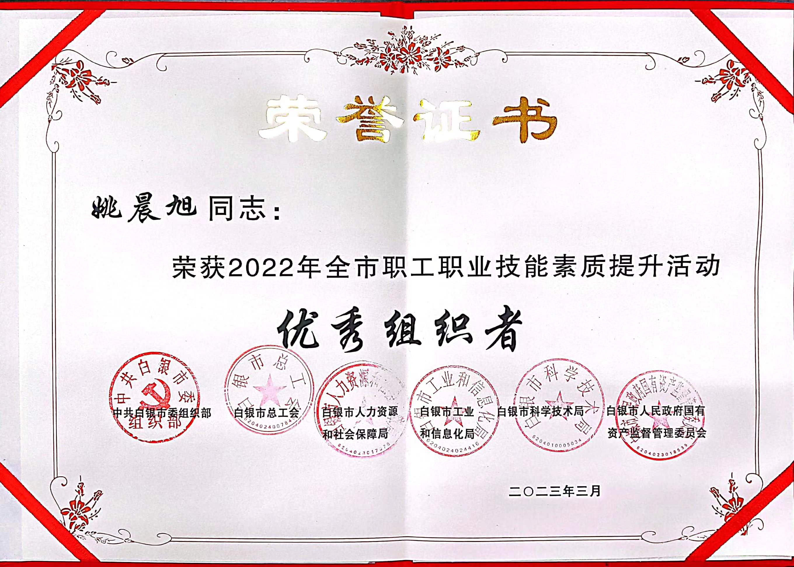 近日,白银市职工职业技能素质提升活动2022年白银市职工职业技能素质提升活动“优秀组织单位”和“优秀组织者”揭晓,白银市产品质量监督检验所获得“优秀组织单位”奖,姚晨旭同志获得“优秀组织者”奖。