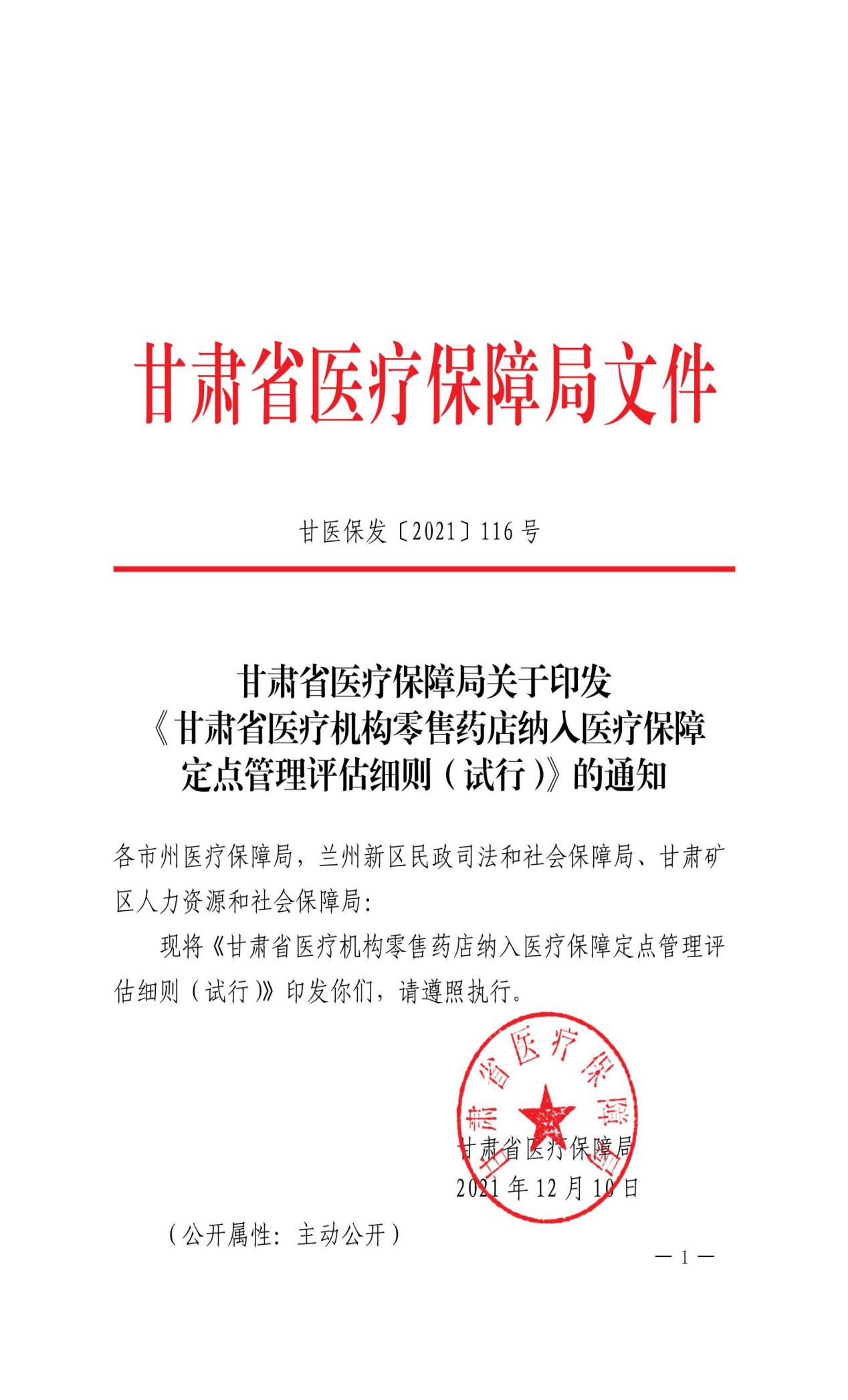 各县(区)医疗保障局: 为规范全市医药机构定点管理,现将《甘肃省医疗保障局关于印发〈甘肃省医疗机构零售药店纳入医疗保障定点管理评估细则(试行)〉的通知》(甘医保发〔2021〕116号)转发给你们,请认真贯彻执行。