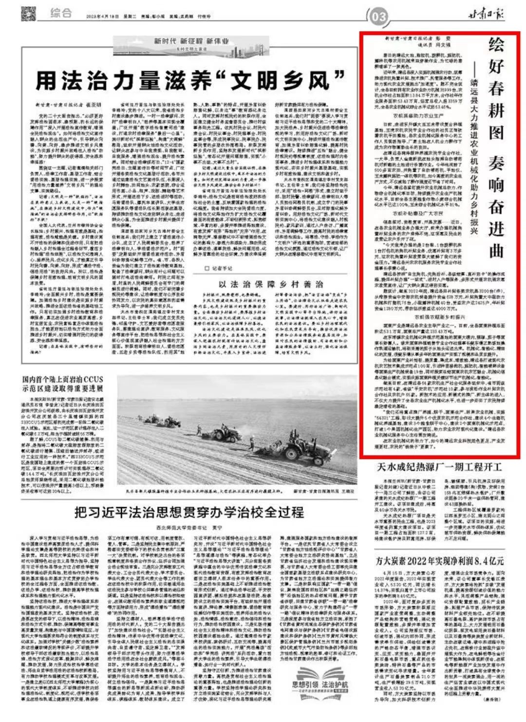4月18日,《甘肃日报》刊发《绘好春耕图 奏响奋进曲——靖远县大力推进农业机械化助力乡村振兴》,报道靖远县深入实施机械强农行动,统筹推进农机购置补贴、技术推广、托管服务等工作,助力现代农业发展跑出“加速度”。