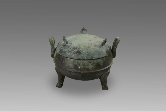 铜鼎,高17.5厘米,口径14.5厘米,青铜质。子母口、扁圆腹、圆底,腹中部有弦纹,有双附耳,下有三蹄足。盖为圆形,上有三个环形钮,现收藏于白银市博物馆。