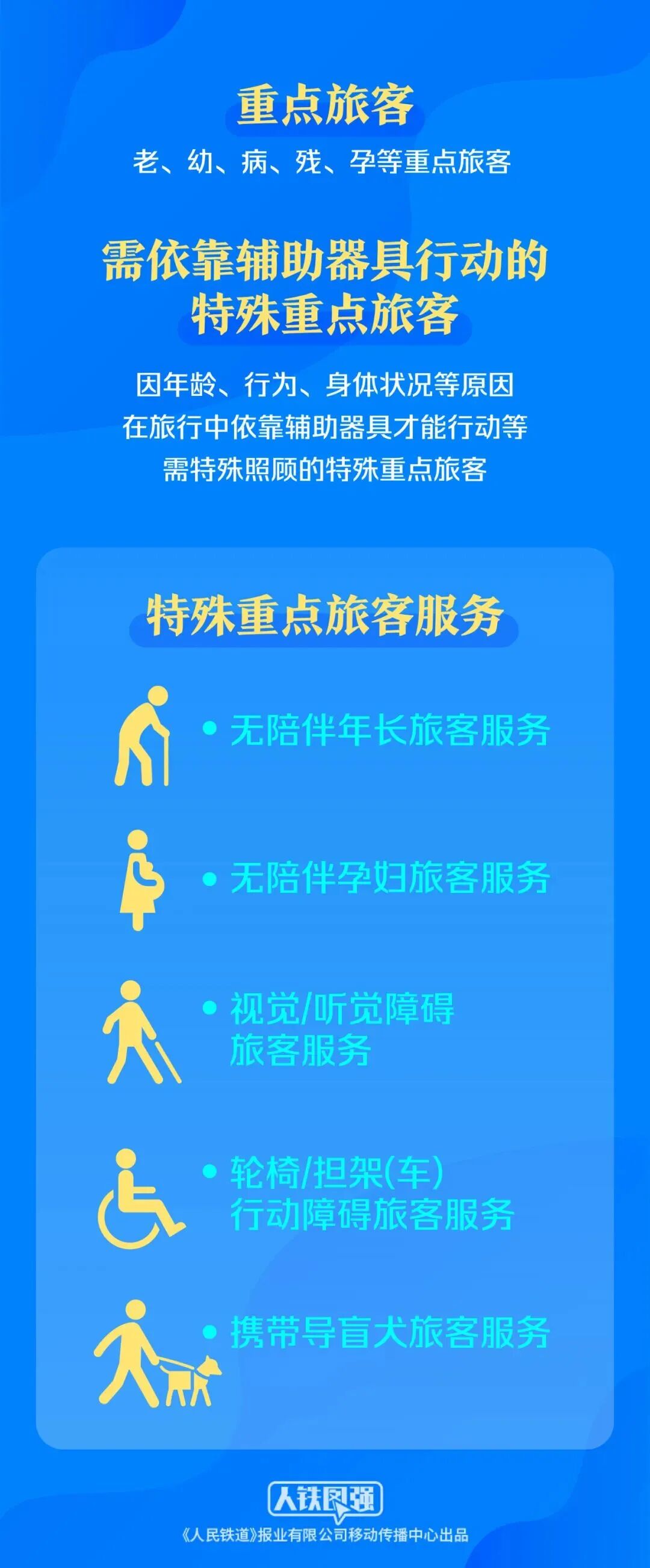 铁路部门提示,铁路特殊重点旅客服务具体办理流程,可关注“铁路12306”常见问题和“中国铁路”官方微博、微信公众号出行指南。有需求的乘客可以通过铁路12306App或拨打铁路12306客服电话进行重点旅客服务预约。车站工作人员接到预约后,会根据重点旅客出行日期、车次、进出站服务需求等,提供“一对一”定向帮助,让您全程无忧。