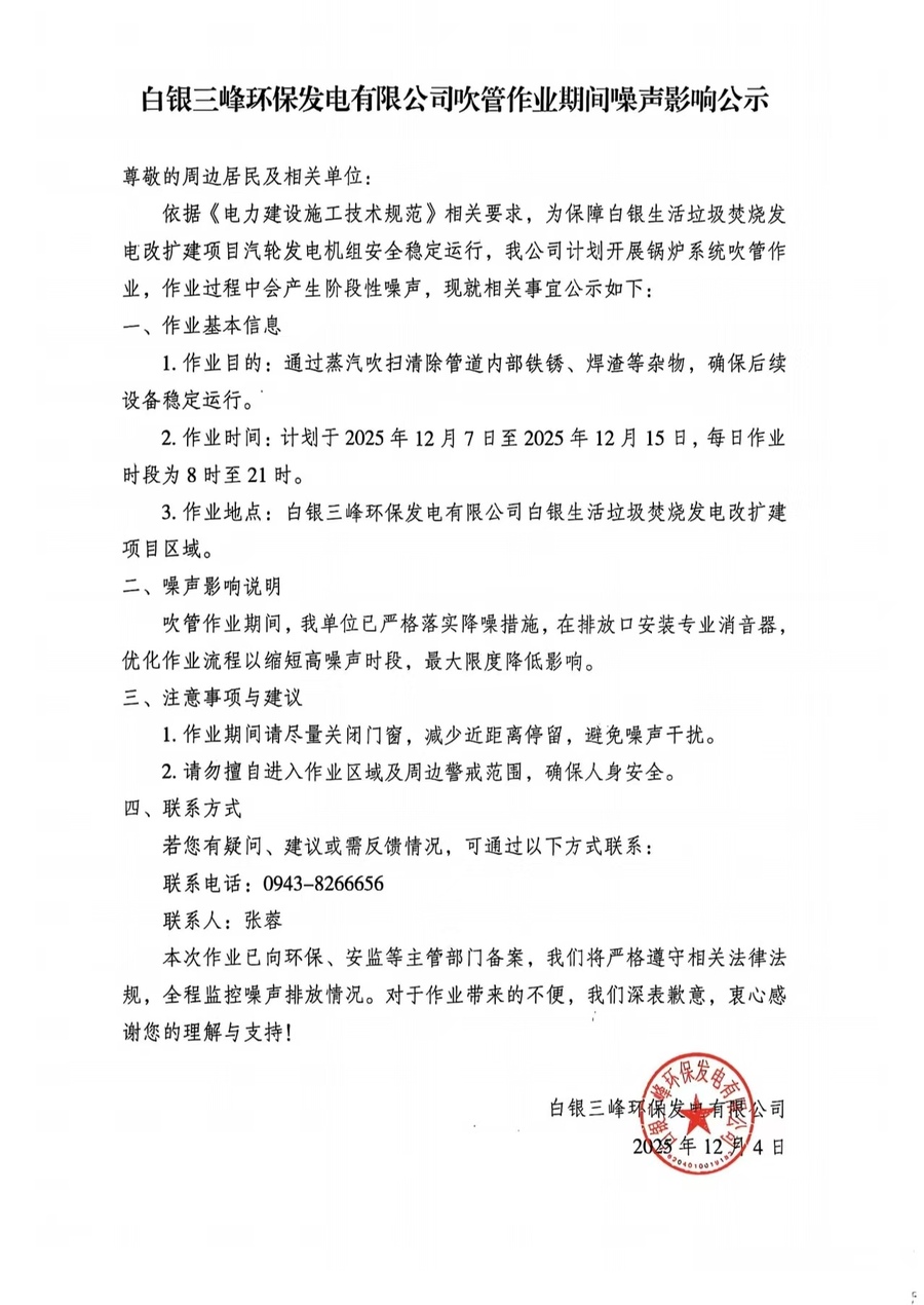 白银三峰环保发电有限公司吹管作业期间噪声影响公示