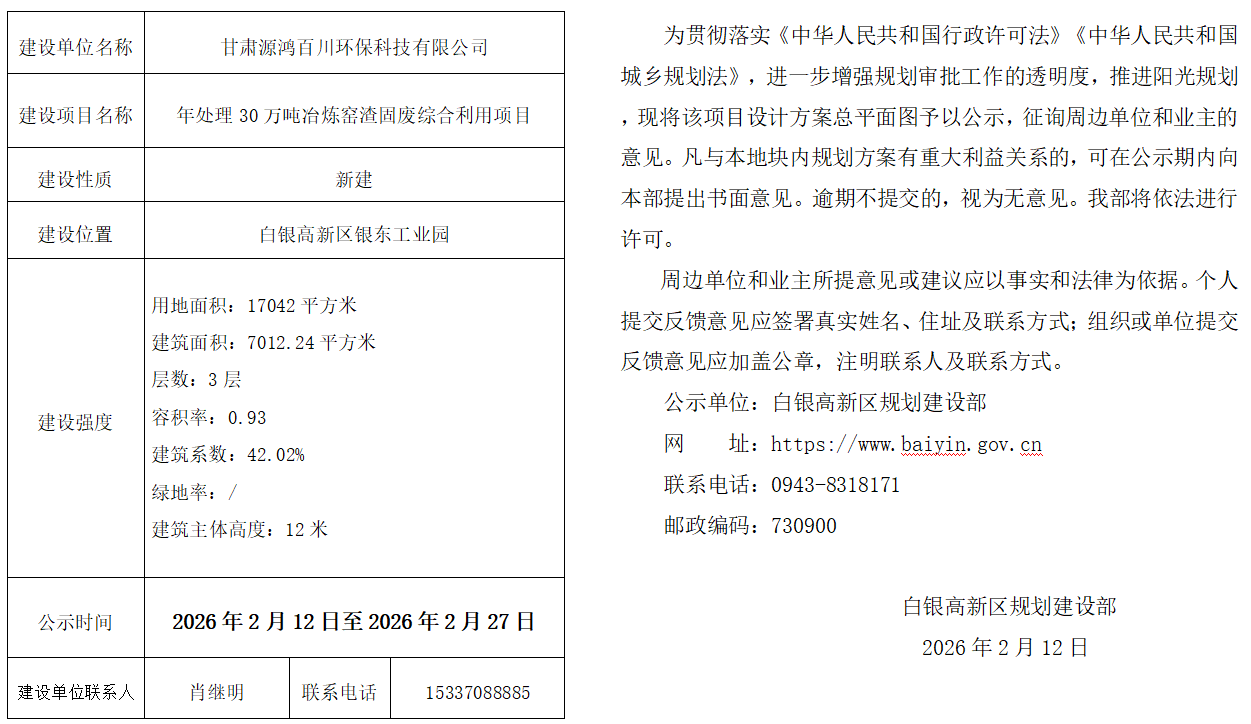 甘肃源鸿百川环保科技有限公司年处理30万吨冶炼窑渣固废综合利用项目总平面公示公告