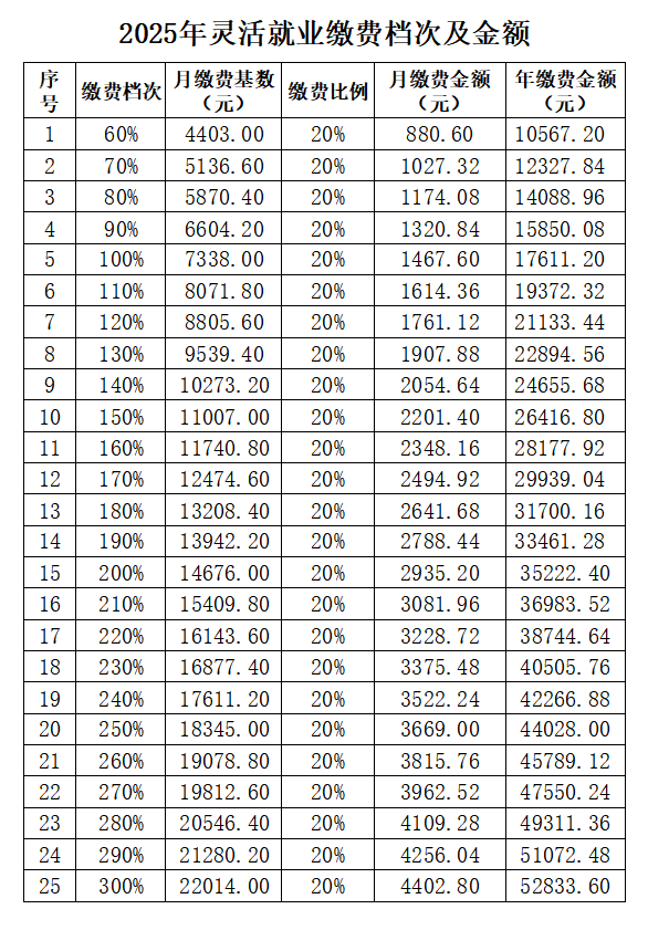 根据甘肃省人力资源和社会保障厅 甘肃省财政厅 甘肃省统计局 国家税务总局甘肃省税务局《关于公布2025年甘肃省职工基本养老保险缴费基数的通知》(甘人社通〔2025〕261号)文件精神,现将2025年灵活就业人员缴纳养老保险费有关事项提示如下: