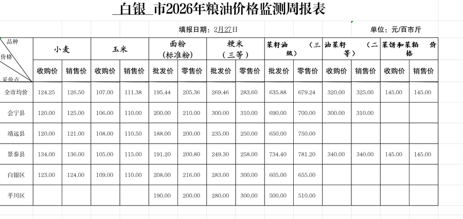 白银市2026年粮油价格监测月报表第2期