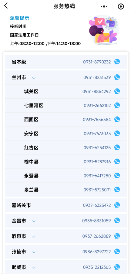 点击“服务网点”即可查看全省各级社会救助机构的服务热线,点击即可直接拨打服务热线进行咨询。