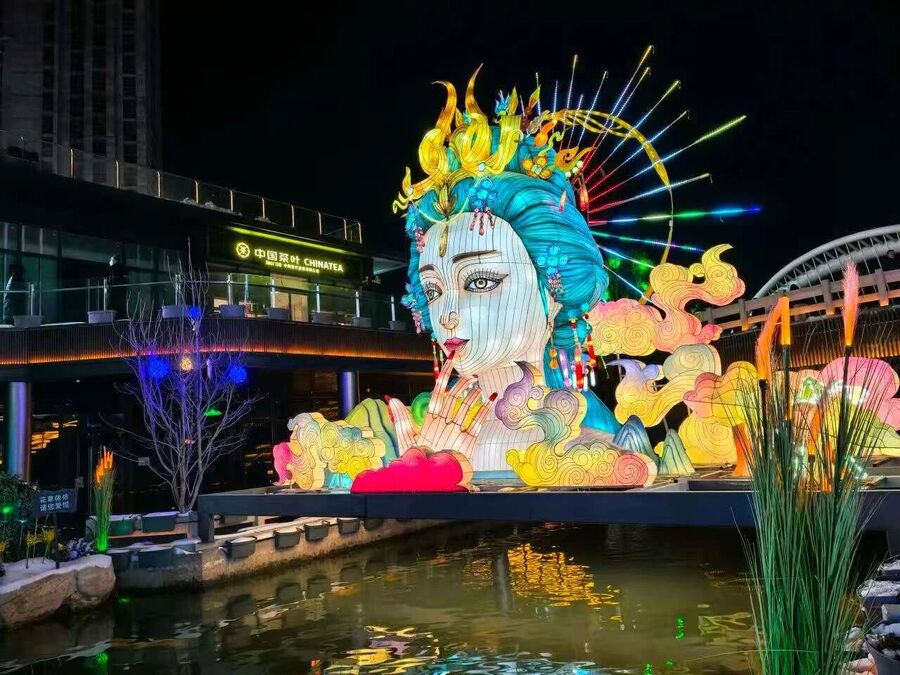 水街沿靖乐渠而建,亭台廊桥错落,灯笼点缀其间。漫步亲水步道,可见黄河女神像静静伫立水中,似守护着这片土地千百年的安宁。开放式街区设计,让流水、广场与舞台自然交融,白昼清雅,夜晚华灯初上时,更如踏入一幅灯火交织的画卷。