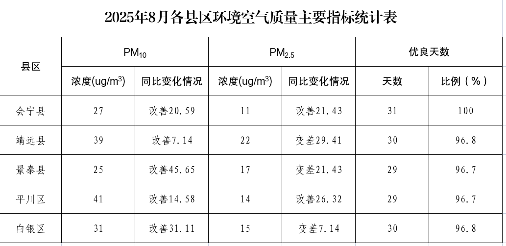 2025年8月各县区环境空气质量主要指标统计表