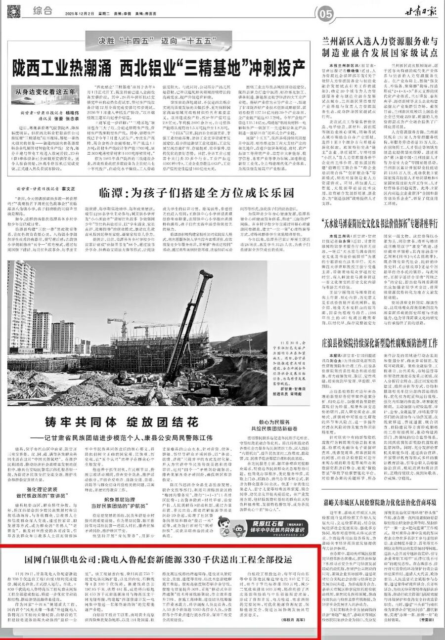 12月2日,《甘肃日报》报道,甘肃陇电入鲁配套新能源330千伏送出工程(白银)顺利完成建设、调试及验收,正式投入运行。