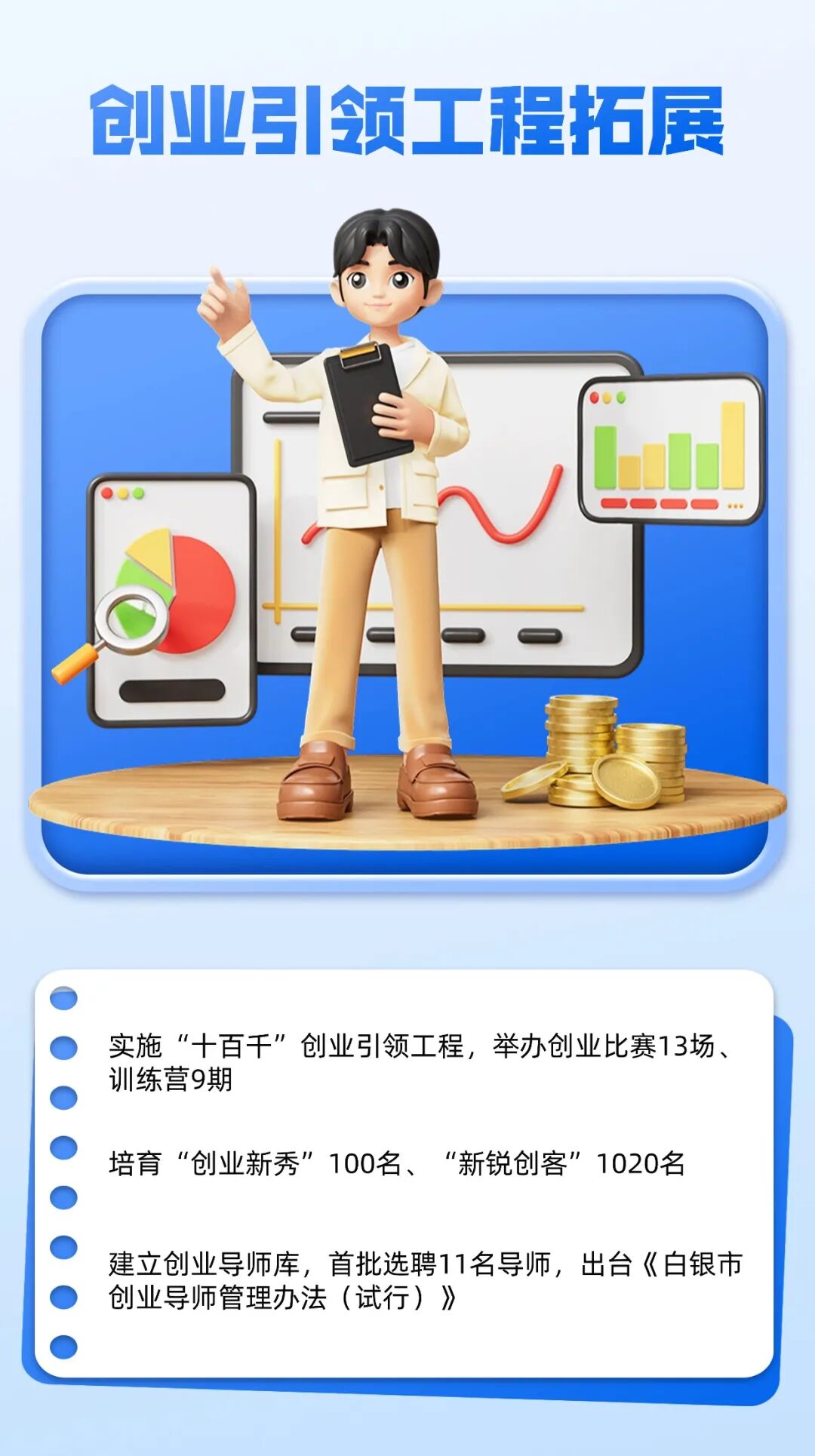 创业引领工程丰富拓展。创新开展“十百千”创业引领工程,举办比赛13场次、创业训练营9场次,培育“创业新秀”100名、“新锐创客”1020名。成功举办以“科学职业指导、精准就业服务”为主题的第二届、第三届公共就业服务专项业务竞赛白银市选拔赛。出台《白银市创业导师管理办法(试行)》,选聘11名成功创业者、知名企业家、创业投资人、专家学者等为白银市第一批创业导师。