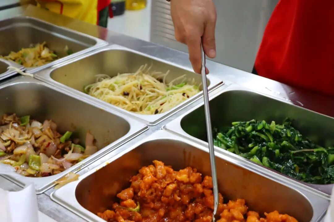说话的间隙,工作人员已将热气腾腾、营养丰富的午餐盛到了老人的餐盘里:香气四溢的粉条炒肉、清爽可口的时令蔬菜,主食有米饭和各种杂粮饼。