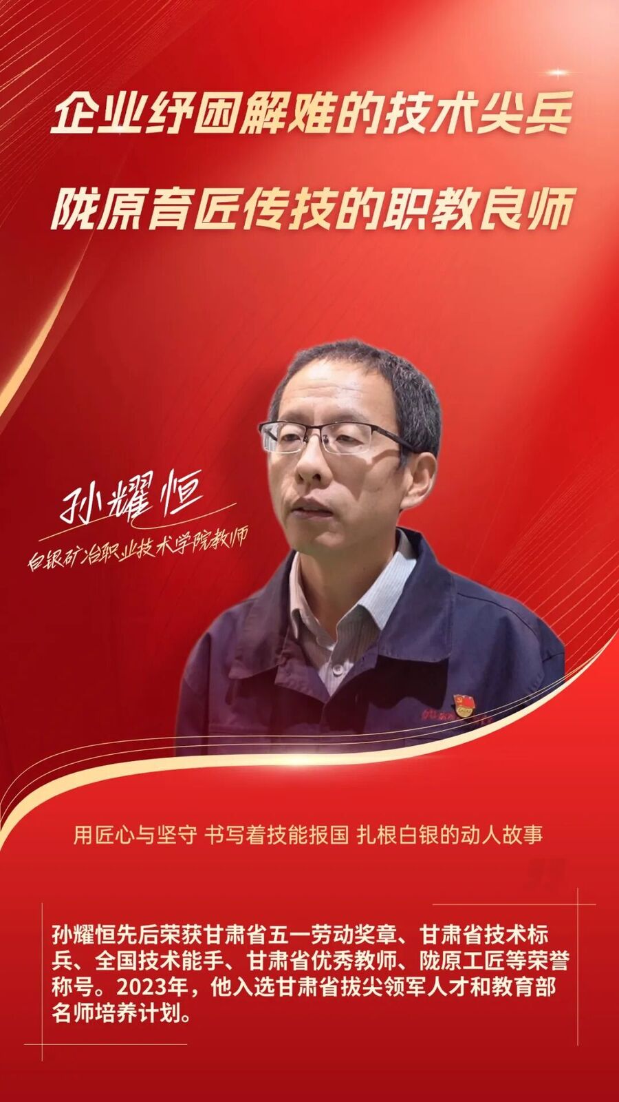 二十余载春秋,他以车间为战场、以讲台为阵地,既是为企业纾困解难的技术尖兵,也是为陇原育匠传技的职教良师,用匠心与坚守,书写着技能报国、扎根白银的动人故事,他就是白银矿冶职业技术学院教师孙耀恒。