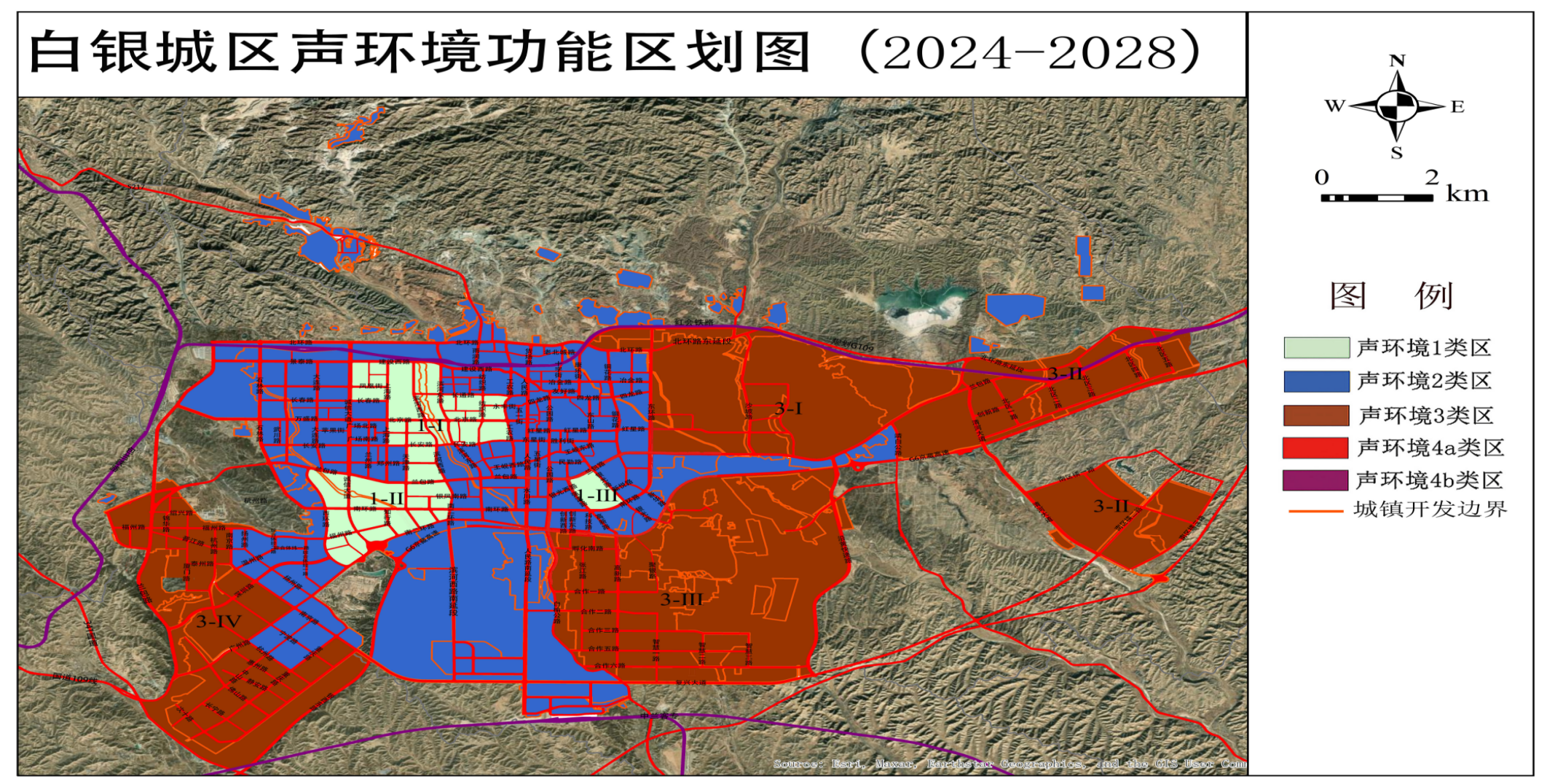白银区人民政府,白银高新区管委会,市政府有关部门,中央、省在银有关单位: 《白银城区声环境功能区划分方案》已经市政府第64次常务会议审议通过,现印发给你们,请结合实际,认真贯彻执行。 白银市人民政府办公室 2025年1月8日 (此件公开发布) 白银城区声环境功能区划分方案 一、区划适用范围 白银城区声环境功能区划范围以中心城区城镇开发边界为依据,北至北环路,东至白银区与靖远县行政边界,南至白银高铁南站,西至国道109北京至拉萨公路。包括城市核心区,银西产业园组团、高铁及银南生态城组团、银南工业园组团、银光集团组团、白银集团组团、银东工业园组团以及西北铜工业组团共七个组团,以北京路为载体的东西向城市发展轴和以人民路为载体的南北向城市发展轴,由上下孤山和西大沟河道组成的西部生态廊道、沿金沟形成的城市滨水景观廊道、沿银山路形成的生态防护廊道、由东大沟和清河大道组成的东部生态防护廊。即“一核七组团、两轴五廊道”,道路区域范围包括城市主次干道和铁路干线,区划面积共计120.39平方公里。 二、声环境功能区划 本次划分主要有四类区域,分别为1类区、2类区、3类区和4类区(分为4a类和4b类区域),因白银城区范围内目前没有明显的疗养区、高级别墅区、高级宾馆区等特别需要安静的区域,故未划分0类区。 (一)1类标准适用区 1类区为金岭公园及周边片区、银凤湖生态居住片区和银光公园片区,总面积约7.79平方公里。 1-Ⅰ.金岭公园及周边片区,边界范围:长春路-诚信大道-建设西路-滨河东路-长通路-工农路-长安路-滨河西路-兰包路-天津路-长安路-上海路-长春路。 1-Ⅱ.银凤湖生态居住片区,以西环路-兰包路-滨河西路-南二环路为界。 1-Ⅲ.银光公园片区,以强湾路-兰包路-银光路-南环路为界。 (二)2类标准适用区 2类声功能区为白银城区声环境功能区划范围内除1、3类声环境功能区以外居住、商业、工业混杂区域,总面积约40.5平方公里。 (三)3类标准适用区 3类声功能区主要以工业区为主,包括白银集团组团、银东工业园组团、银光集团组团和银南工业园组团、银西产业园组团,总面积约57.1平方公里。 3-Ⅰ.白银集团组团,区域范围:红会铁路-北环路-东环路-兰包路-清河大道-红会铁路。 3-Ⅱ.银东工业园组团分为北区和南区,北区范围:西起靖白公路-兰包路-清河大道,东至白银区行政边界,与靖远县相接,北至规划国道109,南至京藏高速;南区范围:清河大道-城镇开发边界-清河大道-南区横三路-城镇开发边界-南区横二路-城镇开发边界-南区横一路-清河大道。 3-Ⅲ.银光集团组团和银南工业园组团,区域范围:西至白榆公路,北以京藏高速为界,南至复兴大道,东至沿黄快速通道及城镇开发边界。 3-Ⅳ.银西产业园组团,除园区内面积大于0.5平方公里的生活小区及机场用地外的其他区域,区域范围为:兰包路-国道341-银西东路-南京路-重庆路-杭州路-广州路-南京路-福州路-城镇开发边界-兰包路。 (四)4类标准适用区 4类声环境功能区包括城市主次干道及其两侧区域;穿越白银城区的包兰铁路干线及两侧区域,面积为15平方公里。 4a类标准适用区域:包括诚信大道、银山路、人民路、北京路等29条主干道和上海路、银光路、东山路、兰州路等107条次主干道以及中川机场-白银市-平川快速路、沿黄快速路、京藏高速等3条快速路。当临街建筑低于三层楼房以上(不含三层)时,交通干线边界线外一定距离内的区域划分为4a类声环境功能区,距离确定方法如下:相邻区域为1类声环境功能区,距离为45米;相邻区域为2类声环境功能区,距离为30米;相邻区域为3类声环境功能区,距离为20米。当临街建筑高于三层楼房以上(含三层)时,将临街建筑面向交通干线一侧至交通干线边界线的区域定为4a类声环境功能区。 4b类标准适用区域:4b类区域主要包括包兰线和中兰客专线经过城区的两侧区域,相邻区域为1类声环境功能区,距离为45米;相邻区域为2类声环境功能区,距离为30米;相邻区域为3类声环境功能区,距离为20米。 具体4类标准适用区域详见附件2。 三、其他 (一)本区划自批准之日起实施。《白银市城区声环境功能区划》(市政办发〔2018〕253号)同时废止。 (二)村庄原则上执行1类声环境功能区要求,工业活动较多的村庄以及有交通干线经过的村庄(指执行4a或4b类声环境功能区要求以外的地区)可局部或全部执行2类声环境功能区要求;集镇执行2类声环境功能区要求;独立于村庄、集镇之外的工业、仓储集中区执行3类声环境功能区要求。 (三)对于4b类声环境功能区与4a类声环境功能区有重叠的部分,划定为4b类声环境功能区。 (四)本区划由白银市生态环境局负责解释并监督实施。 附件:1.白银城区声环境功能区划示意图 2.白银城区声环境功能区4类标准适用区域 附件1 白银城区声环境功能区划示意图