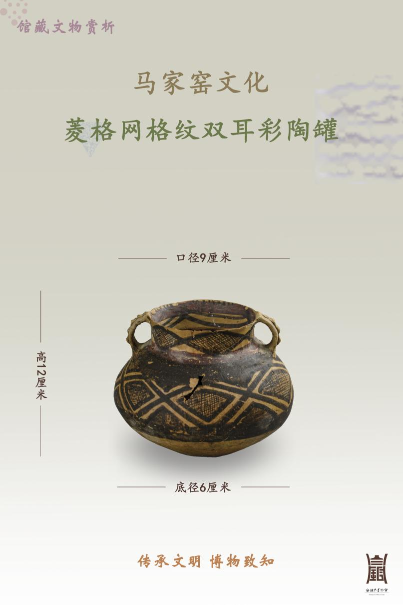 马家窑文化 菱格网格纹双耳彩陶罐