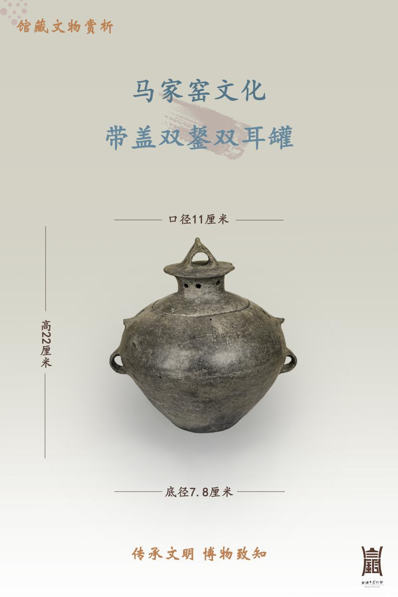 ●泥质灰陶。盖为塔形,敛口,颈部有小孔,溜肩,肩部两个残鋬,圆腹,双腹耳,平底。