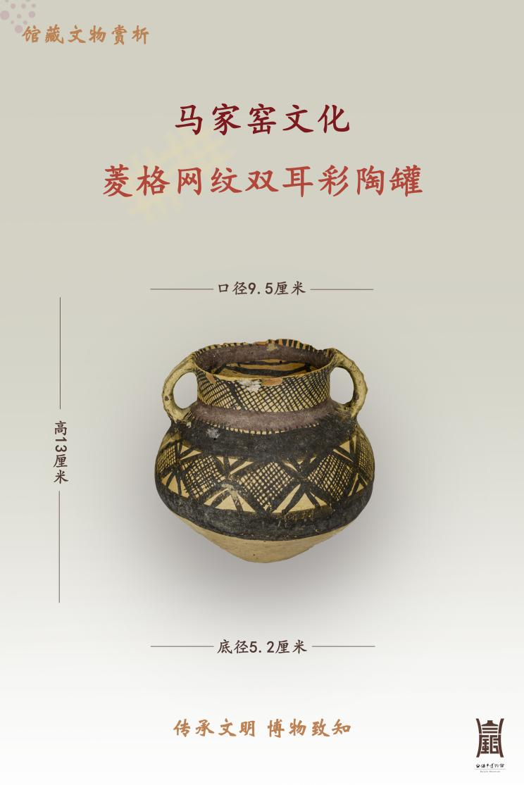 ●泥质红陶。侈口,短直颈,溜肩,圆腹,双肩耳,平底。施黑、红彩,口沿内侧饰一圈红色宽带纹和垂弧纹,颈部饰网格纹,耳部堆塑,肩部饰宽带锯齿纹,腹部饰菱格网纹。