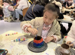手工制作环节,一疙瘩橡皮泥拿在孩子们的手里,个个爱不释手。一双双小手把泥搓成长条,然后在垫板上盘了起来,越盘越高。有的盘成杯子,有的盘成碗,有的盘成罐子,没有标准,没有模板,随心所欲。心灵手巧的孩子们还将自己的作品进行了点缀,蓝色杯子上涂上白点,红色罐子上做一个黄色的手把,黑色坛子上画一朵牡丹......做得认真,玩得开心。