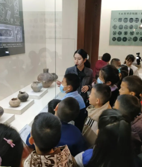 活动伊始,研学老师何佳带领小朋友们参观了《白银史前文化艺术展》。经过讲解,孩子们了解了新石器时代马家窑文化不同时期陶器的构造、纹饰及功用。