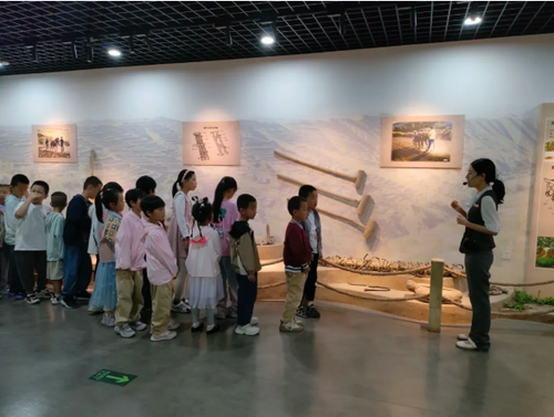 小朋友们排着整齐的队伍走进展厅,研学老师何佳重点给他们讲解了“稼穑农桑”部分。从一年四季农作物生长变化讲到各种农具的功用。何老师由展厅里的一幅“粮仓图片”引出本次研学课堂的主题——探秘千年粮仓。