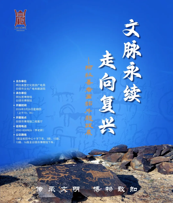 2026年3月26日,文脉永续走向复兴——阿拉善岩画拓片题跋展将亮相白银。展览以贺兰西麓千年岩画为魂,以墨拓题跋为媒,跨越山川阻隔,续写两地绵长文化根脉。