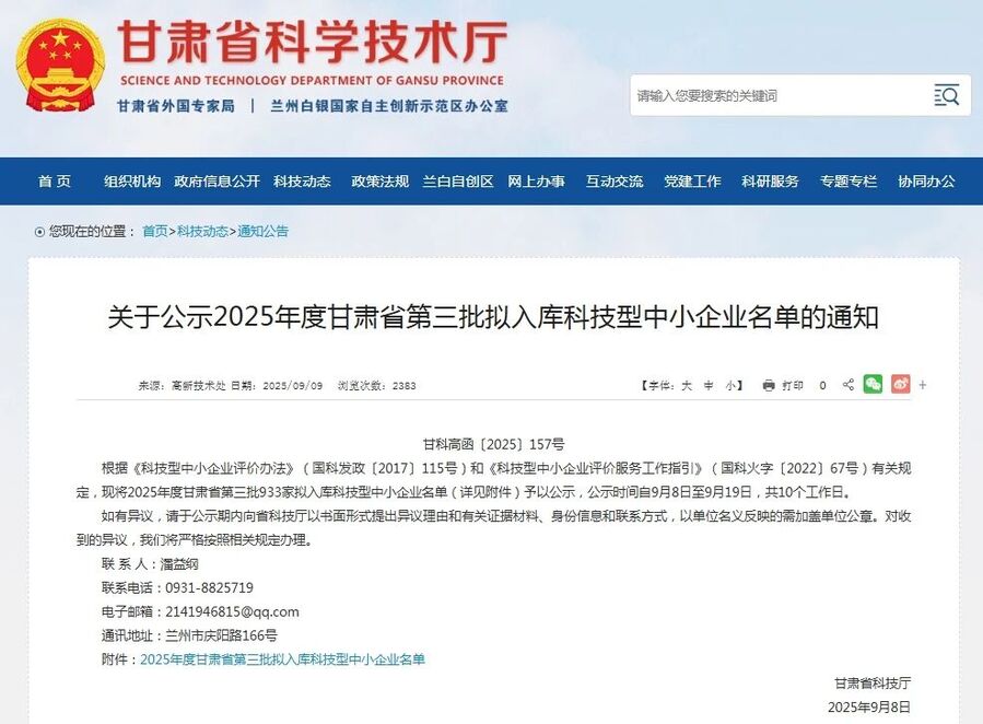 近日,甘肃省科学技术厅公布了甘肃省2025年度第三批入库科技型中小企业名单,白银高新区甘肃天后光学科技有限公司、甘肃鑫润环保科技有限责任公司、白银丰宝农化科技有限公司、白银星宇生物科技有限公司、甘肃奥凯医学工程开发有限责任公司、白银乐天园化学有限责任公司、甘肃穹鼎地理信息有限责任公司、甘肃食道数字科技有限公司、甘肃金宏源生物科技有限公司9家企业入选甘肃省2025年度第三批入库科技型中小企业名单。