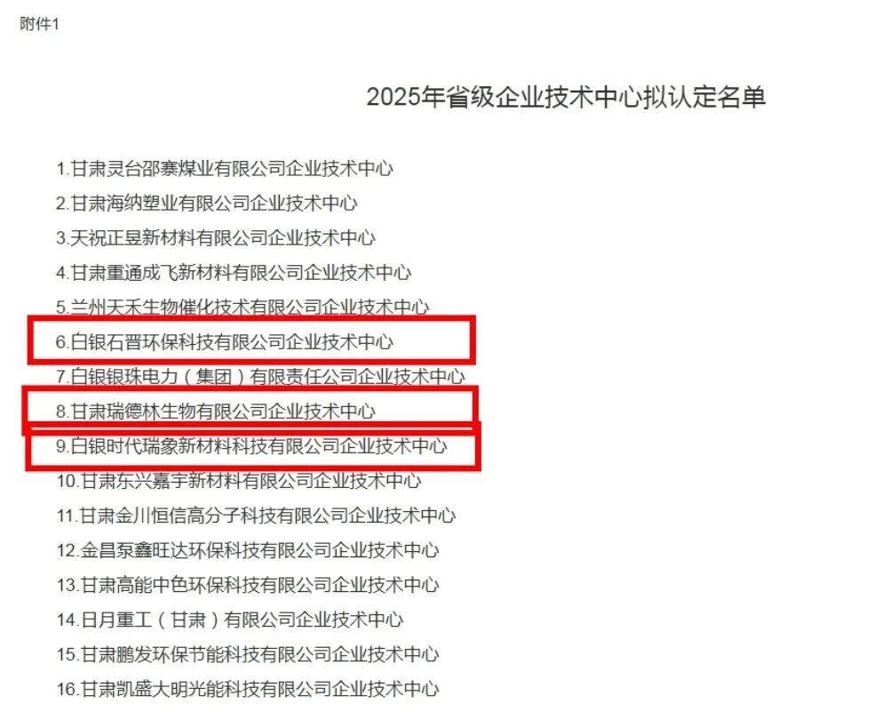 近日,甘肃省工业和信息化厅公布了2025年省级企业技术中心认定名单,白银高新区企业白银石晋环保科技有限公司、甘肃瑞德林生物有限公司、白银时代瑞象新材料科技有限公司3家企业成功获批省级企业技术中心。