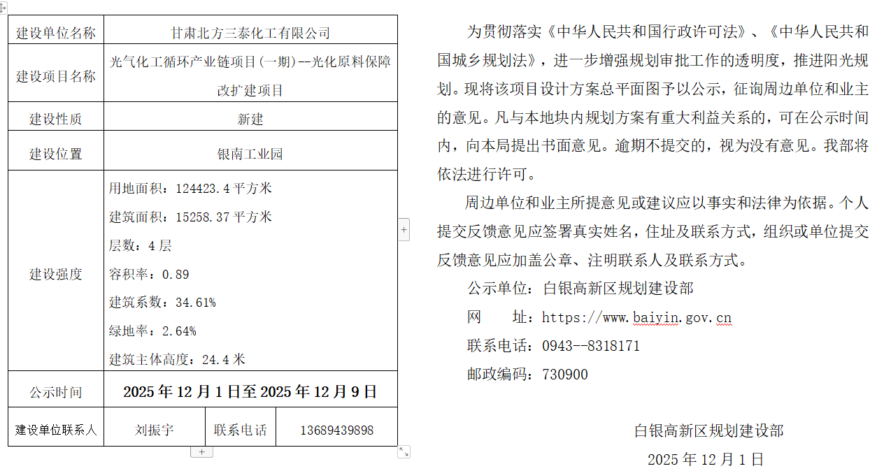 甘肃北方三泰化工有限公司光气化工循环产业链项目(一期)--光化原料保障改扩建项目总平面公示公告