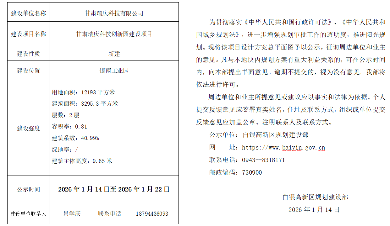 甘肃瑞庆科技有限公司甘肃瑞庆科技创新园建设项目总平面公示公告