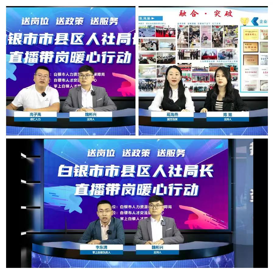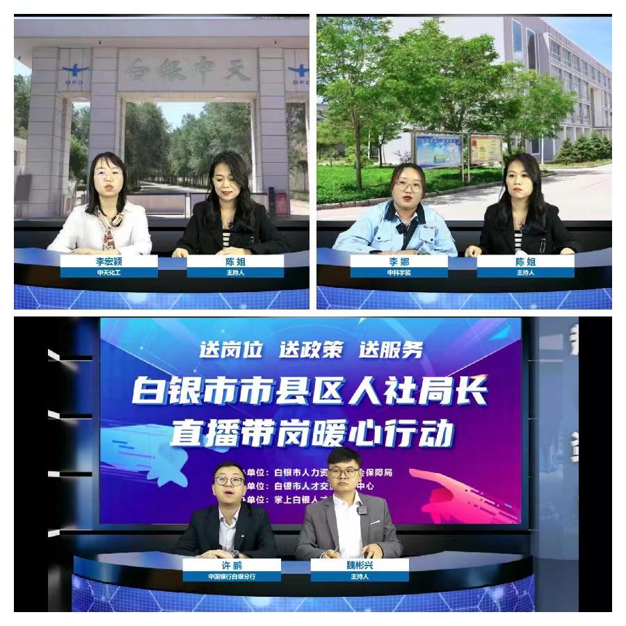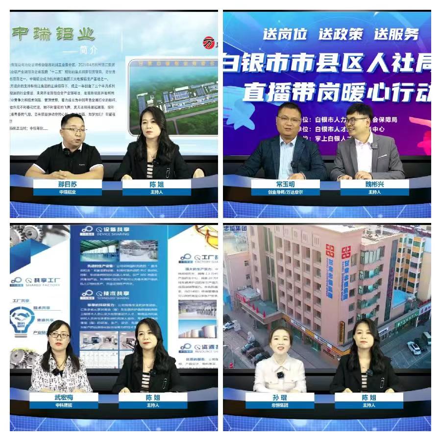 活动现场,市人才交流服务中心负责人详细介绍了我市公共就业服务相关政策;“掌上白银”负责人介绍了白银市就业岗位和就业意愿“双调查”服务平台功能使用和运营情况;中国银行白银分行对“陇原惠岗贷”服务方案及产品额度、利率、期限等优惠政策做了全面介绍;创业导师和人力资源服务公司分别就创业孵化基地功能、劳务输出方向和技巧、外出务工避坑指南等做了分享;甘肃忠恒房地产开发集团有限公司、甘肃中科隆能环境有限公司、甘肃中瑞铝业有限公司、白银中天化工有限责任公司、白银中科宇能科技有限公司、国芳百货6家公司分别推介了各自企业及招聘岗位,并与直播间网友线上互动。此次活动共吸引66家企业参加,提供岗位377个,招聘人数1595人,逾2万人次收看并参与互动。