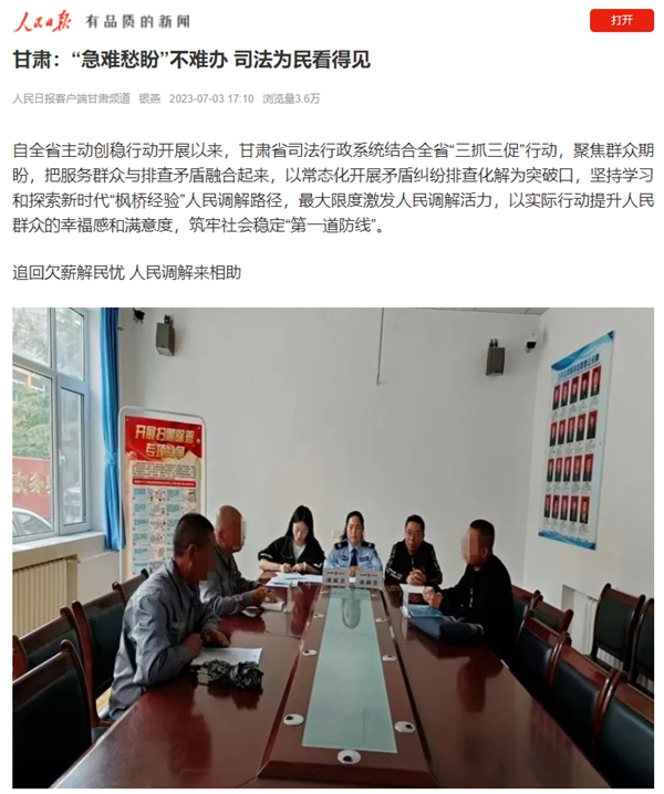 7月3日,人民日报客户端刊文发布了甘肃省司法厅工作新闻稿件——《甘肃:“急难愁盼”不难办 司法为民看得见》,现予以转载。