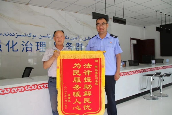 “谢谢你们,谢谢法律援助,感谢党和政府。”受援人梁某边说边将印有“法律援助解民忧 为民服务暖人心”字样的锦旗递到酒泉市阿克塞县司法局工作人员的手中,感谢在阿克塞县司法局公共法律服务中心的帮助下,及时拿到了自己的劳动工资。据悉,梁某因生病需要治疗,想到给某老板干活还未结清的工钱,于是梁某到公共法律服务中心咨询法律援助事宜。工作人员了解梁某的情况后,考虑到梁某的情况符合法律援助相关条件,当即指派酒泉红柳律师事务所律师办理此案,该案在律师的积极办理下及时结案并胜诉,梁某如愿拿到了劳动报酬。