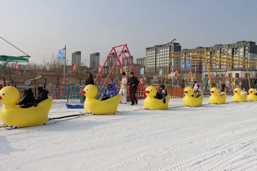 冰雪黄鸭小火车载着孩子穿梭雪地,新开辟的儿童滑雪道上满是小身影。