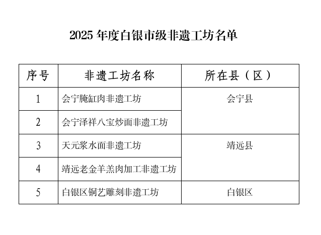 为深入推动非遗保护与传承,促进就业增收,助力乡村振兴,近日,白银市文化广电和旅游局、市人力资源和社会保障局、市农业农村局联合发文,正式认定会宁腌缸肉非遗工坊、靖远老金羊羔肉加工非遗工坊等5家工坊为2025年度市级非遗工坊。