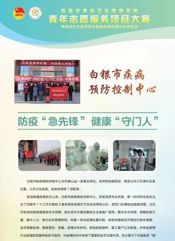 白银市卫生健康委对此次大赛高度重视,并根据省卫生健康委相关要求,在全市卫生健康系统认真开展青年志愿服务项目申报工作,成立市级项目评审组,对所有申报项目进行初审,最终确定白银市第一人民医院“医润夕阳”、白银市红十字中心血站无偿献血、白银市中西医结合医院“中医志愿进社区、健康促进零距离”等3个志愿服务项目参加全省卫生健康系统青年志愿服务项目大赛复审并全部进入决赛路演。同时,推荐白银市疾病预防控制中心以《防疫“急先锋” 健康“守门人”》为主题参加了全省卫生健康系统新时代文明实践志愿服务集中展示交流活动。