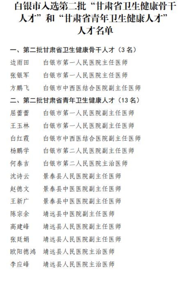 “甘肃省卫生健康骨干人才”和“甘肃省青年卫生健康人才”是甘肃省卫生健康委为充分发挥卫生健康骨于人才示范引领和青年卫生健康人才基础支持作用,盘活全省卫生健康人才存量而开展的人才选拔工作,旨在打造全省卫生健康行业的中坚力量和优秀青年岗位能手,充分发挥高层次人才的关键性和示范性作用以及中初层次人才基础性作用。此次白银入选的16名优秀人才涵盖了呼吸科、骨科、重症医学科等多个专业领域,在临床、科研、教学等方面均具有丰富的经验和卓越的成就,在国内外学术期刊发表了大量高质量的学术论文,取得了一系列重要的科研成果,为我市医疗卫生事业的发展做出了突出贡献。