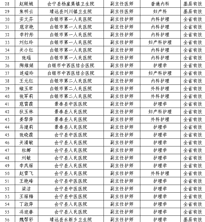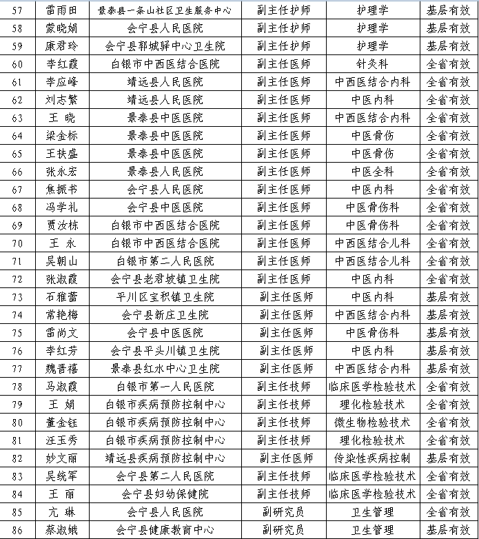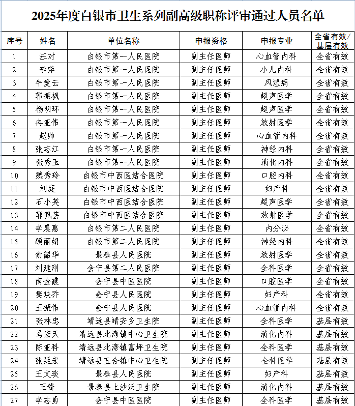 现将2025年度白银市卫生系列高级职称评审委员会评审通过的副高级职称人员进行公示(共86人,其中全省有效66人、基层有效20人,详见附件),接受社会监督。公示时间为2025年12月20日至2025年12月26日,共5个工作日。如对公示人员情况有异议,请在公示期内,通过电话、来信、面谈等形式反映情况,我们将认真受理,尽快核查落实,并如实反馈调查处理情况。公示日期截止,如不存在影响任职资格的问题,将按有关规定印发任职资格文件。