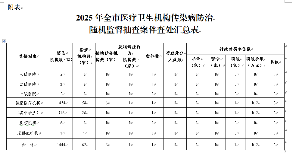 附表:2025年全市医疗卫生机构传染病防治随机监督抽查案件查处汇总表