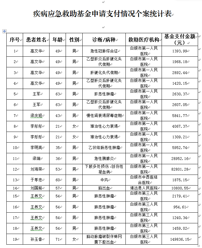 根据《白银市疾病应急救助基金制度实施细则》(市卫医政发〔2022〕18号)规定,经1月27日全市疾病应急救助基金(2026年第一批)专家组评审,共审核通过疾病应急救助基金支付患者19人次310181.94元。现将审核结果予以公示,时间为2026年2月6日至2026年2月12日止。公示期为5个工作日(不含法定节假日)。