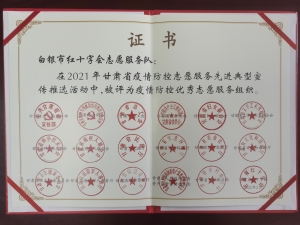近日,甘肃省第五届学雷锋志愿服务“四个十佳”先进典型暨2021年度疫情防控优秀志愿者和志愿服务组织名单公布,白银市红十字会志愿服务队被甘肃省委宣传部等18个部门联合授予“甘肃省疫情防控优秀志愿服务组织”荣誉称号。