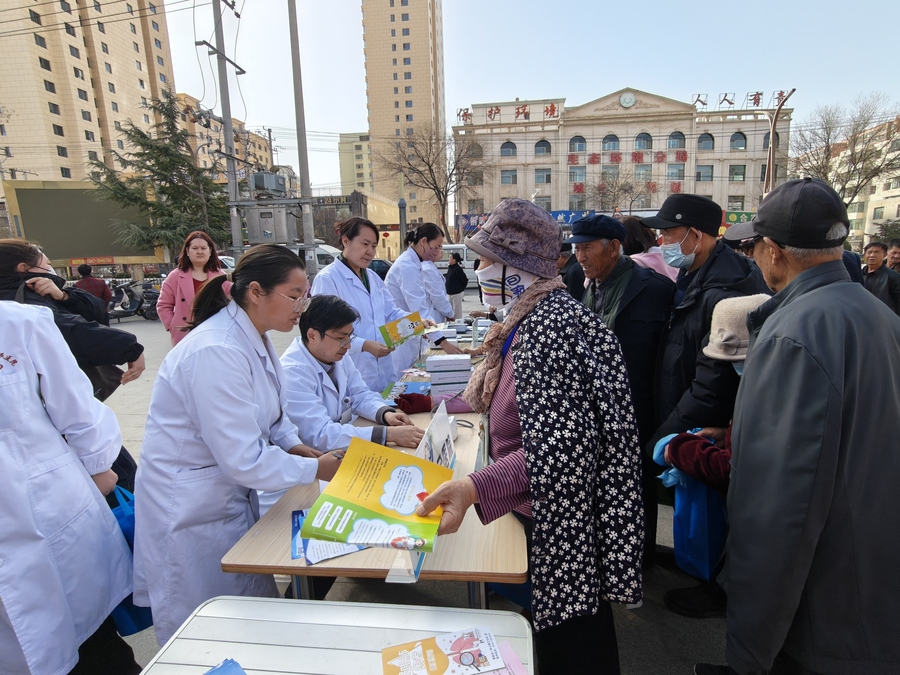 靖远县红十字会在鼓楼前设点义诊,为群众测量血压、普及健康知识。