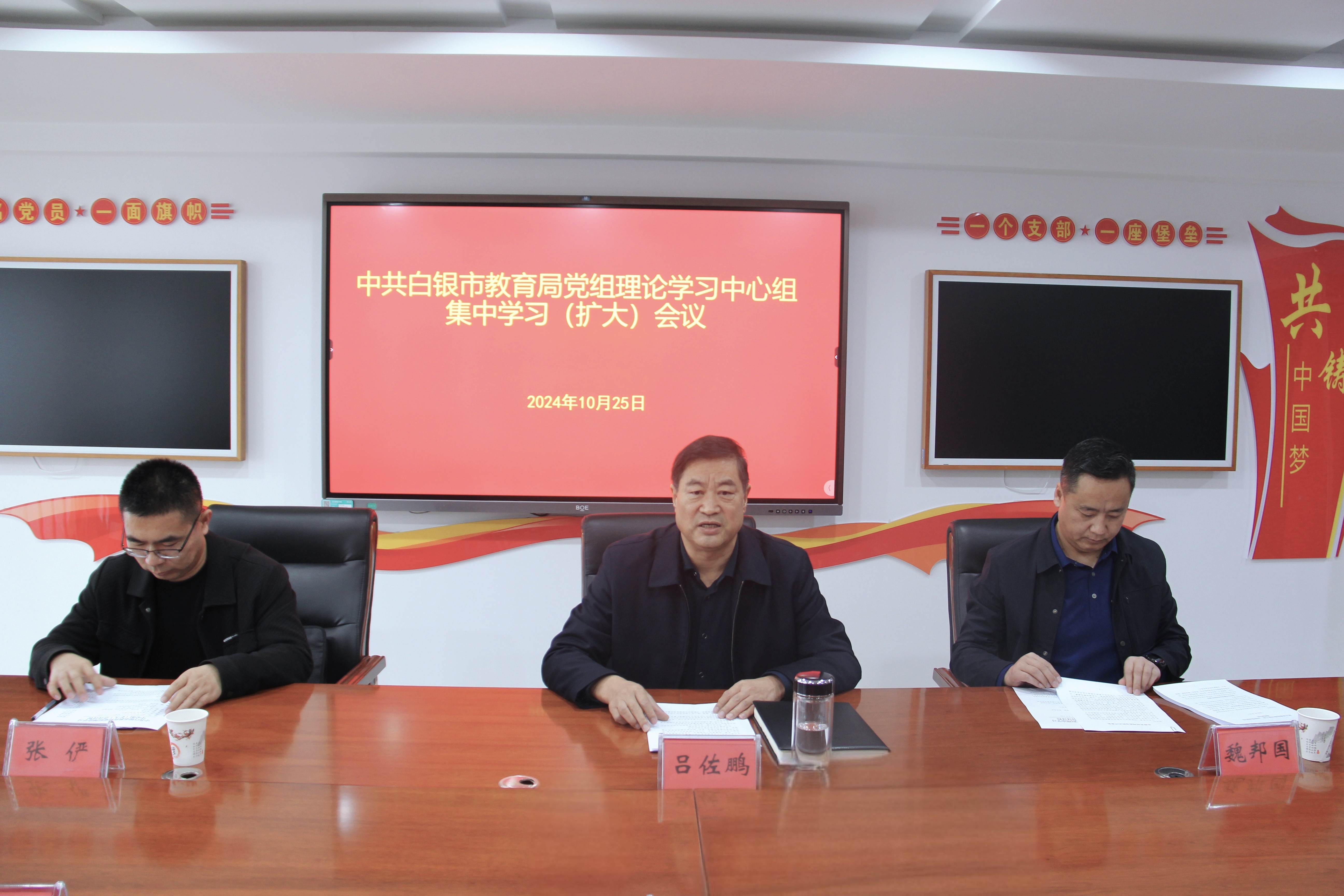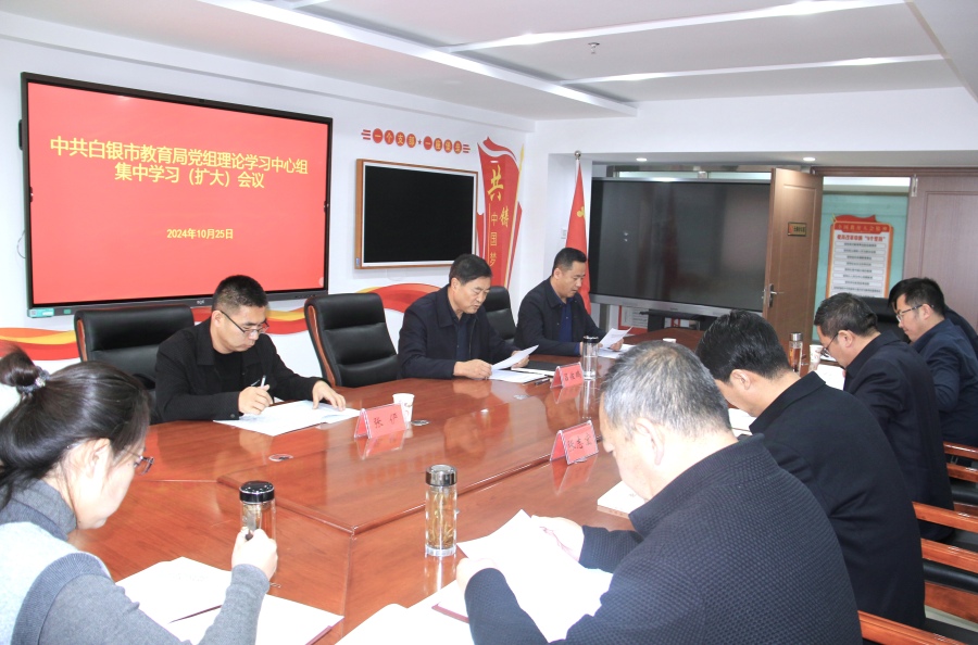 10月25日,市教育局党组召开理论学习中心组集中学习(扩大)会议,深入学习贯彻习近平总书记视察甘肃重要讲话精神,中心组成员围绕“深入学习宣传贯彻习近平总书记视察甘肃重要讲话精神,不断推动白银教育高质量发展”进行了研讨交流。市委教育工委书记,市教育局党组书记、局长吕佐鹏主持会议并讲话。市第一列席旁听工作组组长、市委组织部副部长魏邦国,工作组成员、市乡村干部培训中心主任张俨同志到会列席旁听指导。