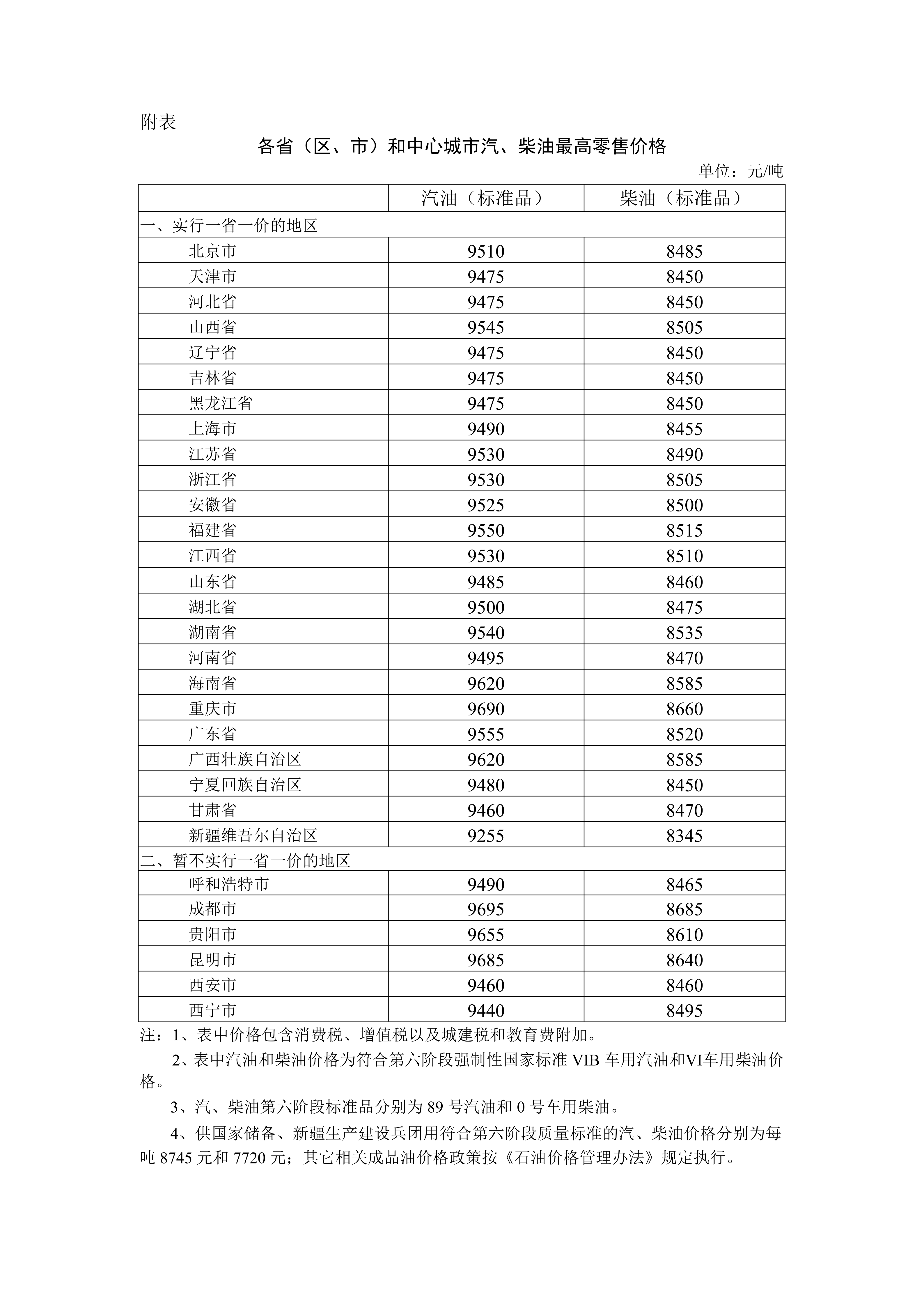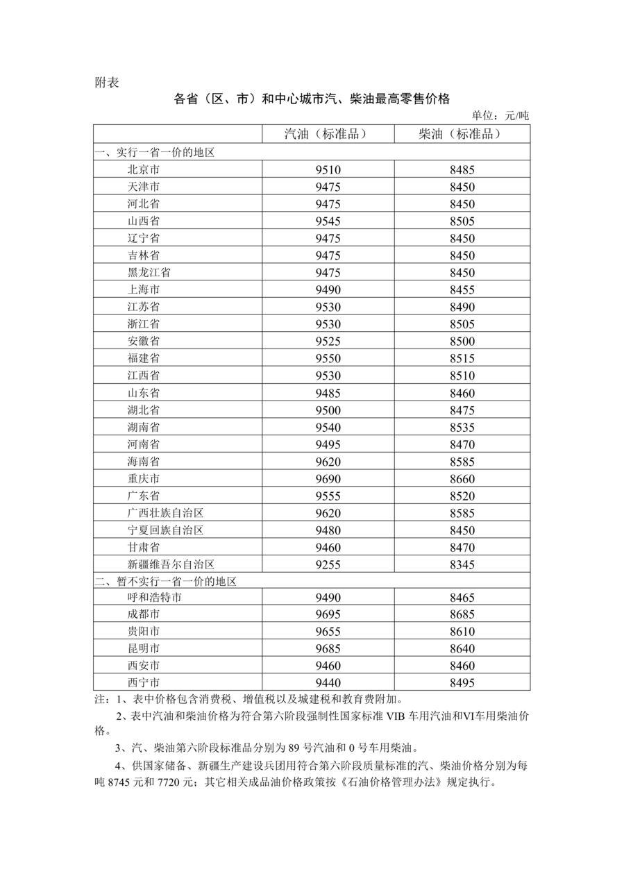 附:各省(区、市)和中心城市汽、柴油最高零售价格