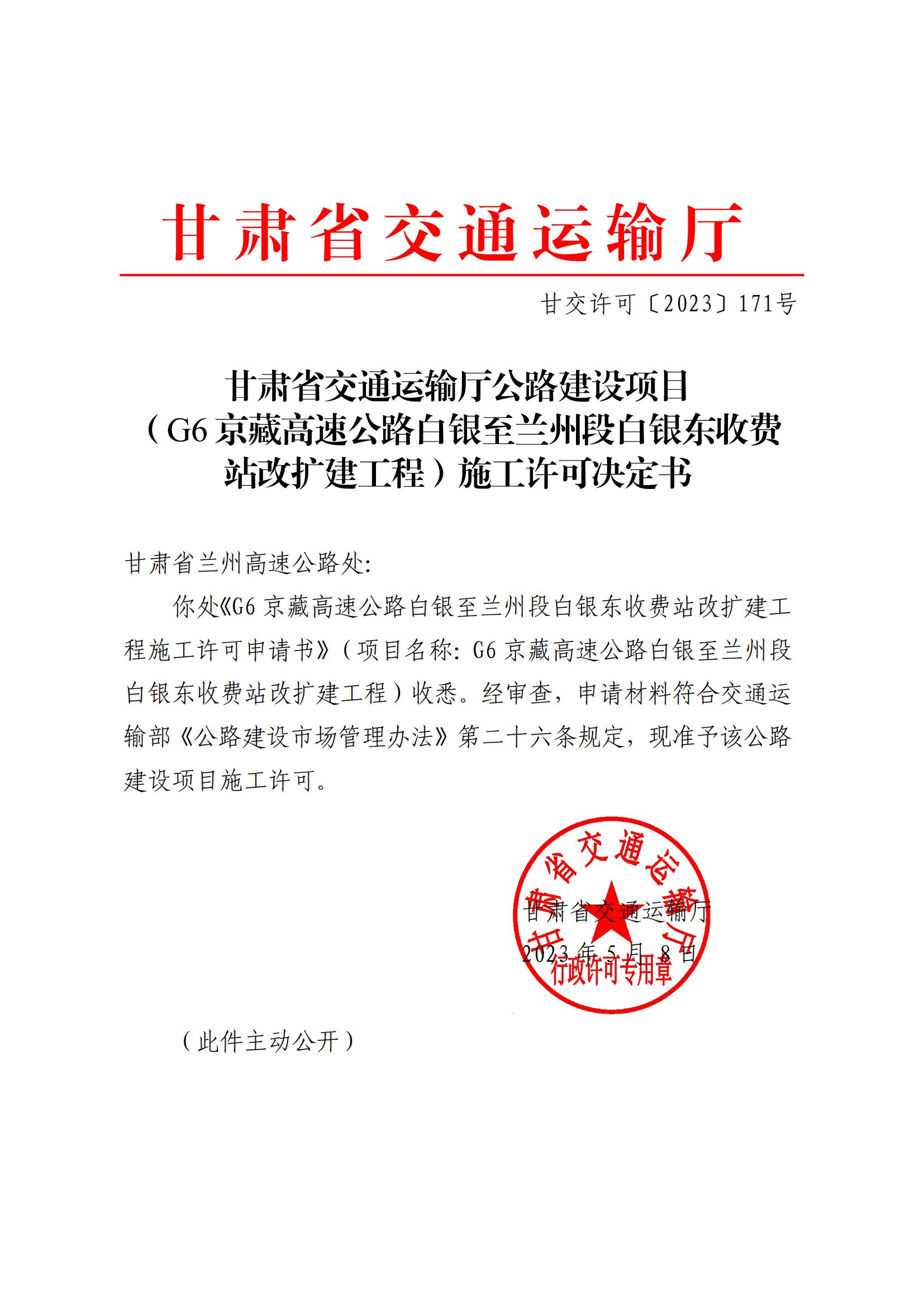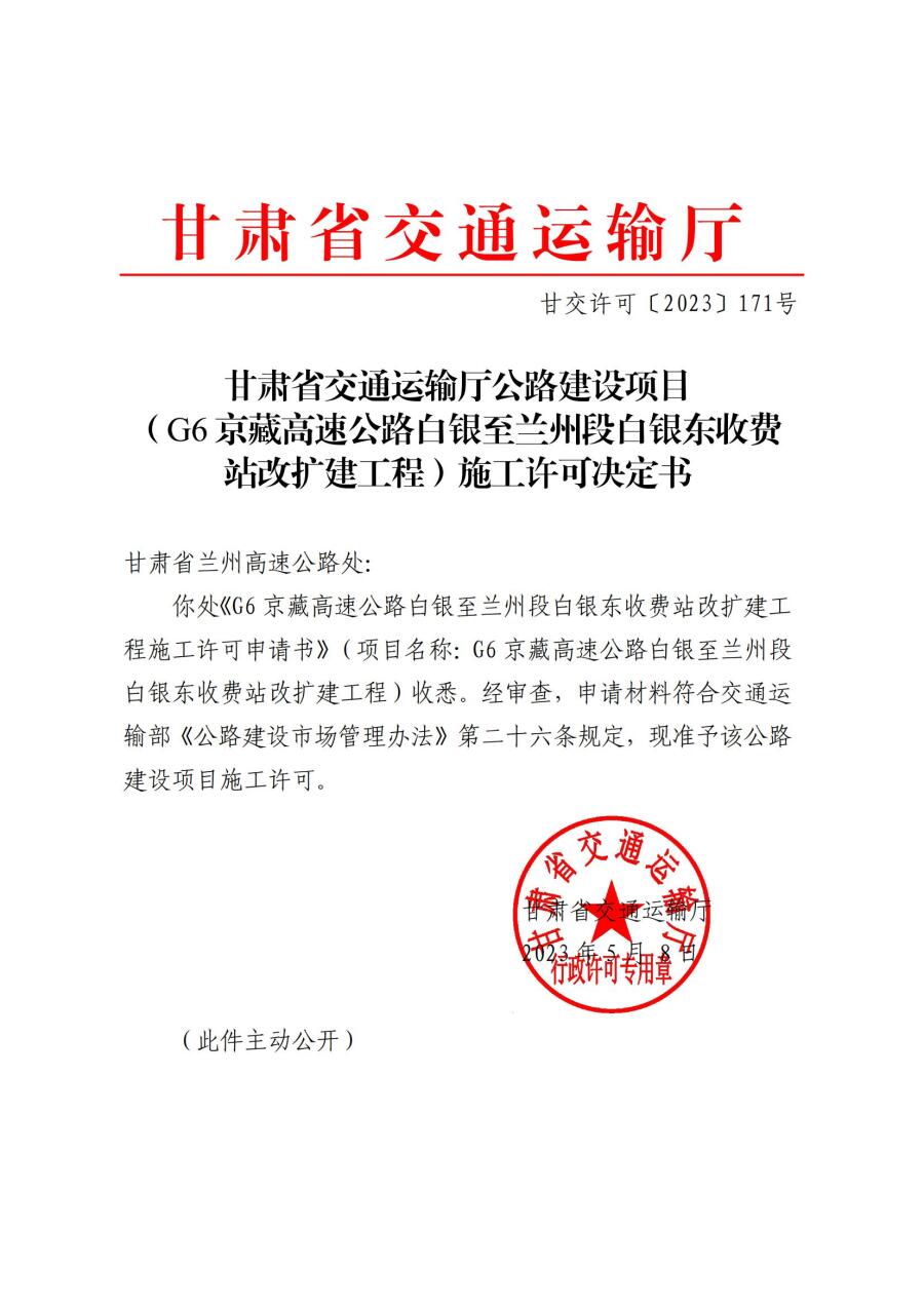 甘肃省交通运输厅公路建设项目(G6 京藏高速公路白银至兰州段白银东收费站改扩建工程)施工许可决定书