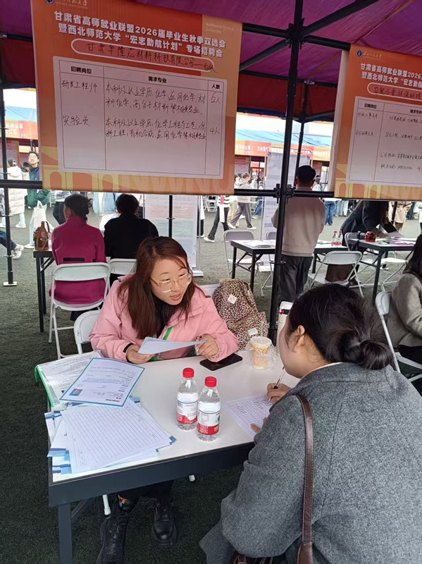 10月18日,白银市科技局组织白银康寓信生物科技有限公司、甘肃华隆芯材料科技有限公司、白银石晋环保科技有限公司、白银小喇叭文化传播有限公司等企业,参加甘肃省高师就业联盟2026届毕业生秋季双选会暨西北师范大学“宏志助航计划”专场招聘会。