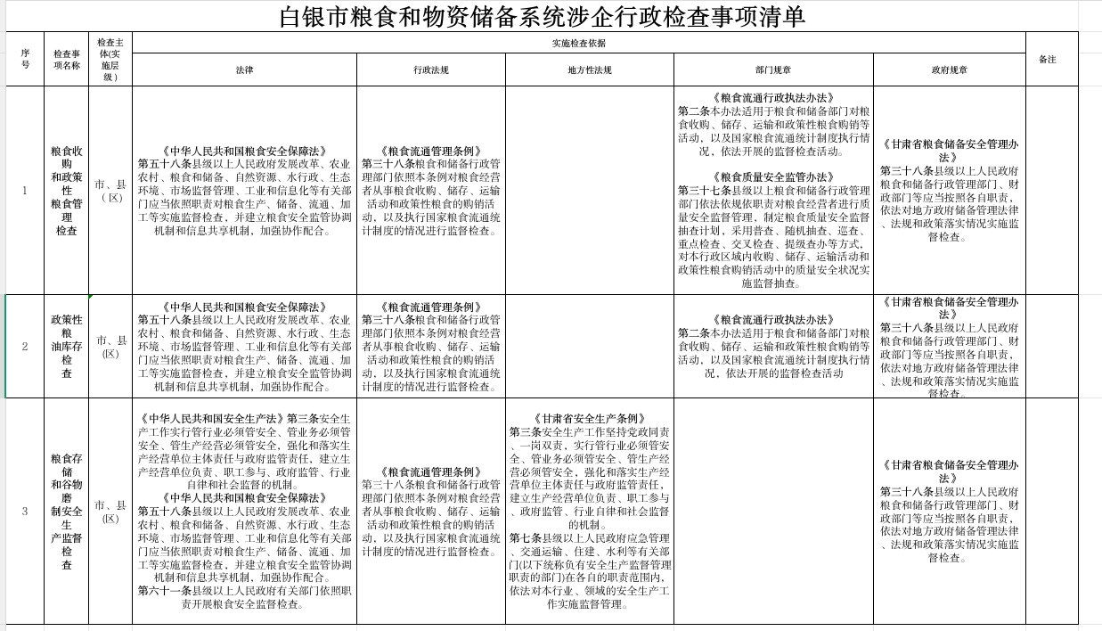 白银市粮食和物资储备系统涉企行政检查事项清单