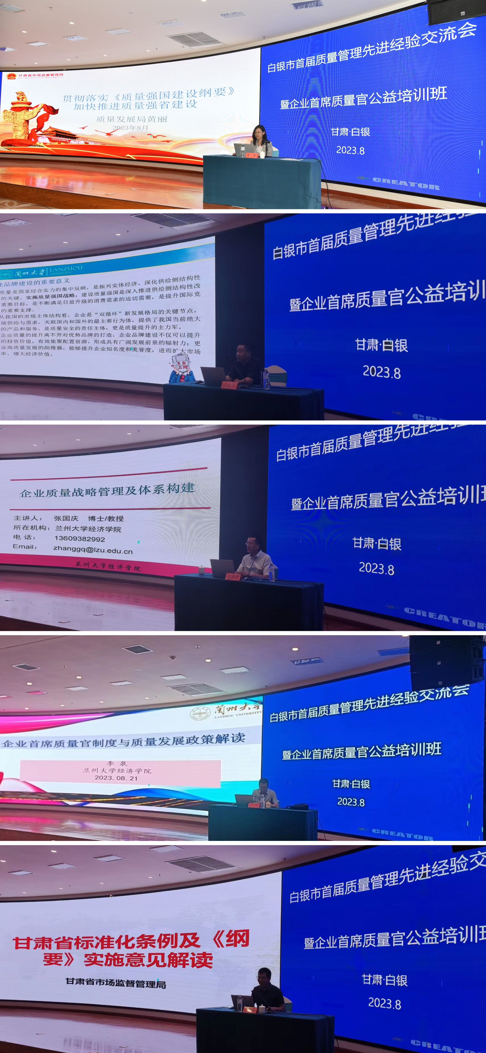 在企业首席质量官公益培训班上,省市场监管局质量发展局副局长黄丽、标准化处一级主任科员张晓春以及兰州大学经济学院教授汪晓文、李泉、张国庆以《质量强国纲要解读》《甘肃省标准化条例及<纲要>实施意见解读》《企业首席质量官制度与我国质量发展政策》《企业质量战略管理及其体系构建》《以甘肃省企业品牌建设助推经济高质量发展》为题进行授课辅导。