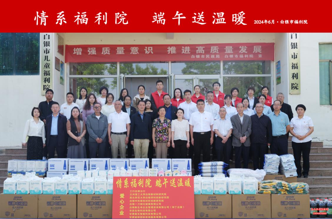 为了弘扬中华民族尊老敬老、爱老助老的传统美德,在端午来临之际,6月7日,白银科技企业孵化器联合党支部联合工行白银分行、兰州理工大学白银新材料研究院、西北师范大学白银师科创新研究院、白银中科绿色材料创新研究院、白银新生命企业管理咨询有限公司(淘丁企服)、白银一刀钢化玻璃有限公司、甘肃陇石智能科技有限公司、白银乐天园化学有限责任公司、甘肃城坤招标咨询服务有限公司等爱心企业开展了“端午粽香飘 党旗映红心”主题党日活动,向白银市福利院的老人们送去书香和祝福。白银市慈善总会、白银市民政局、白银市企业联合会(企业家协会)、白银高新区非公党委、白银区书法家协会、白银科技企业孵化器有限公司、甘肃法翔律师事务所等50余人参加活动。