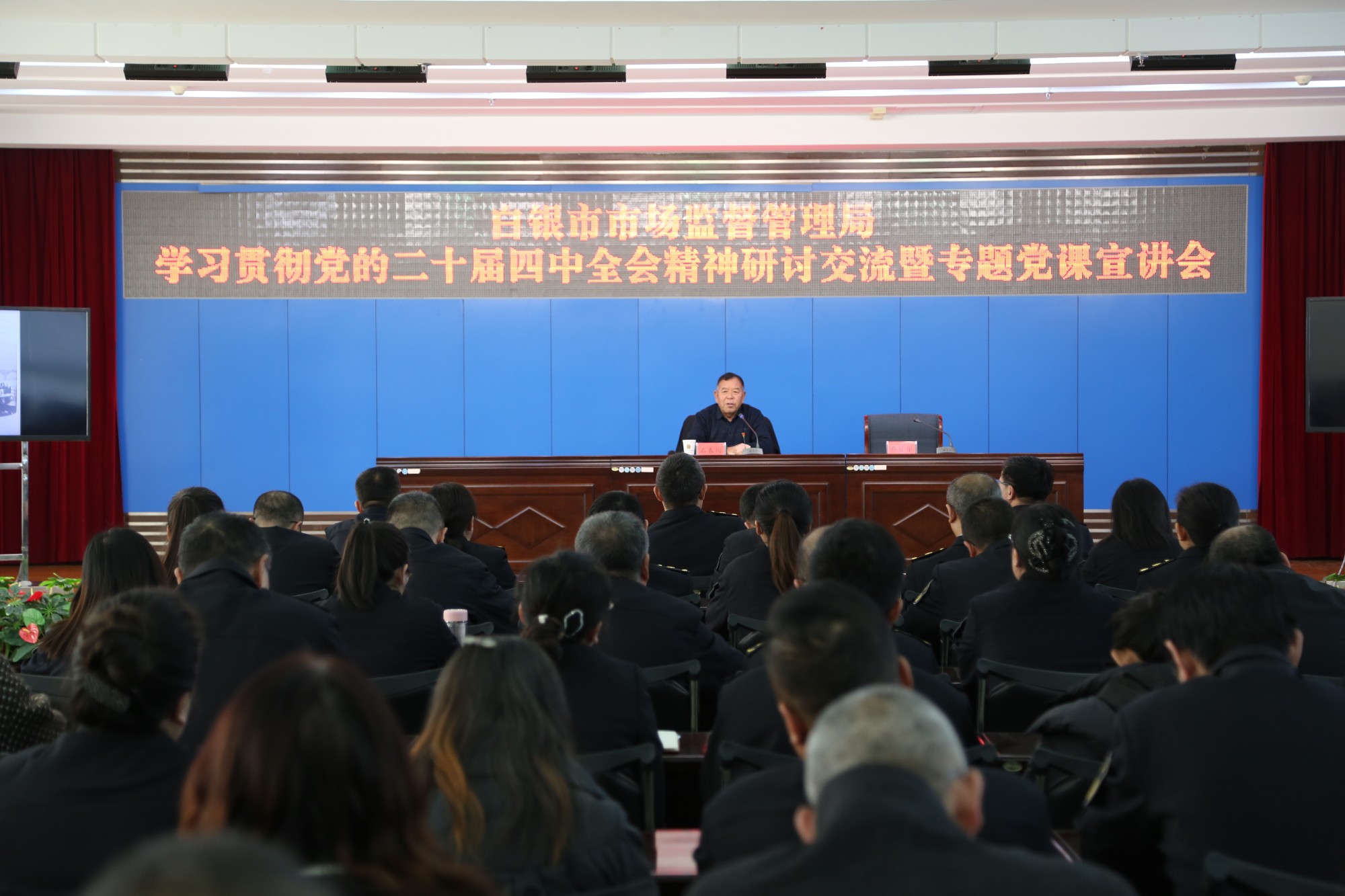 12月3日,白银市市场监督管理局举办深入学习贯彻党的二十届四中全会精神研讨交流暨专题党课宣讲会,特邀陕西省延安市延川县梁家河村党支部老书记石春阳同志讲授“深修党性强信念,筑牢根基勇担当”专题党课。市市场监管局领导班子成员、副县级以上领导干部、机关全体党员干部、各直属单位党员干部以及非公企业党组织书记、党务骨干、党员代表等120余人参加会议。