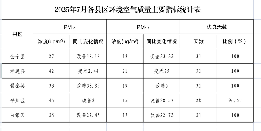 2025年7月各县区环境空气质量主要指标统计表