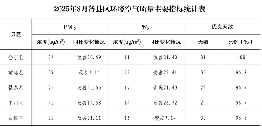 2025年8月各县区环境空气质量主要指标统计表